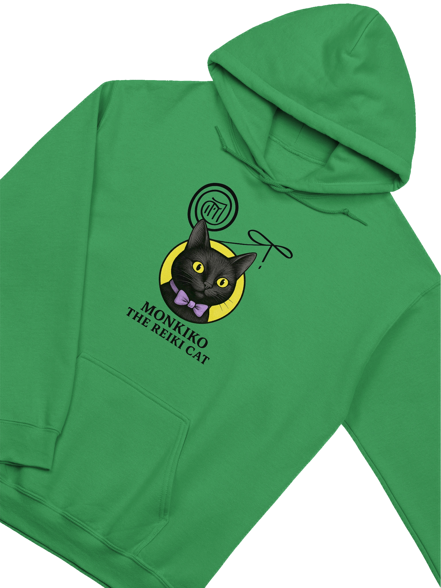 Monkiko The Reiki Cat pops out of the Prosperity Symbol and straight into your heart to share healing energy, laughter and purrs! Gildan Classic Hoodie, unisex sizing, double-lined hood, amusingly stylish.