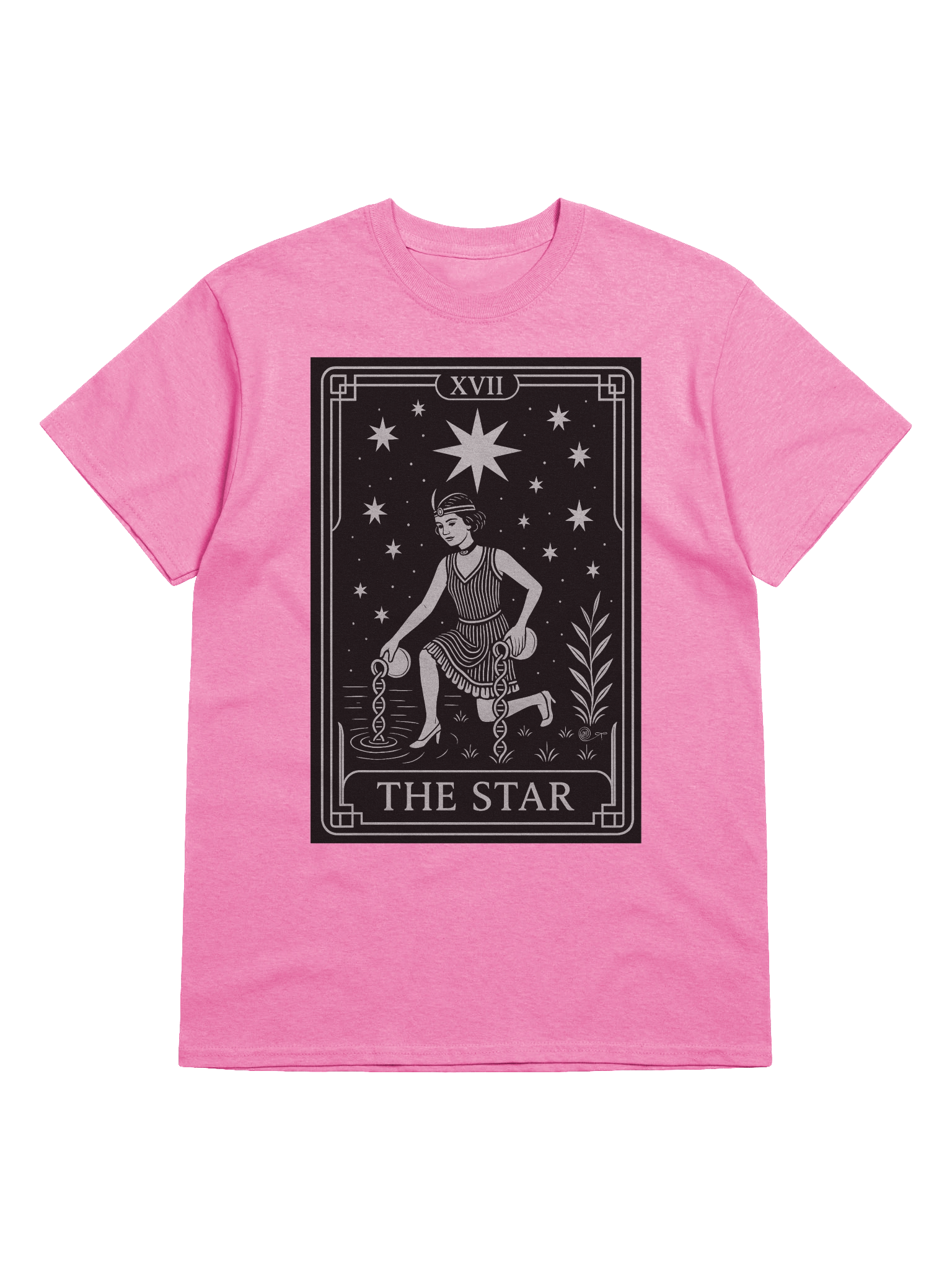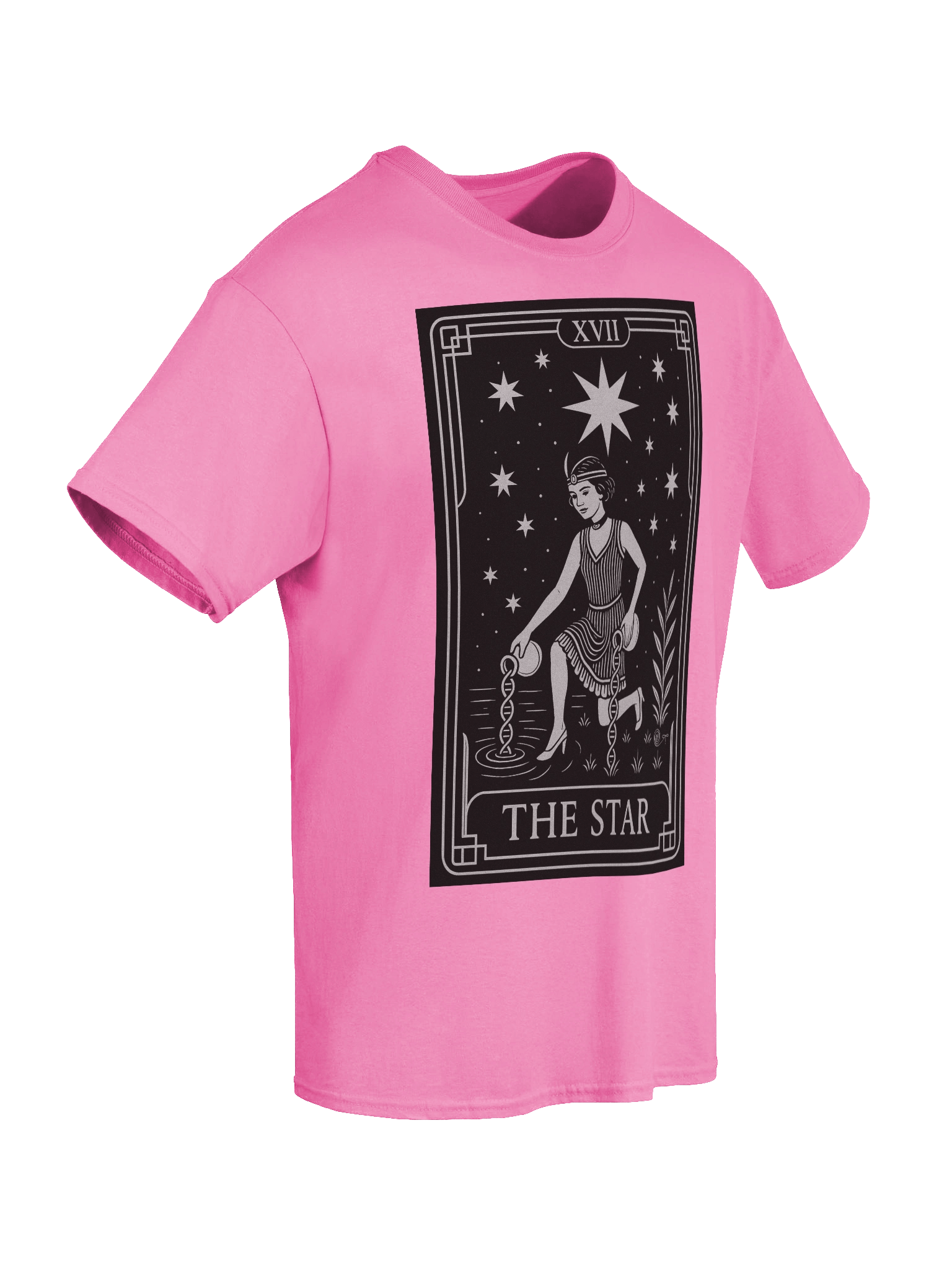 The Star Tarot Card Tee, depicting Tarot by Design™ Major Arcana Card Number 17, features a Roaring 2020's Flapper Girl as she pours gifts of prosperity into the Age of Aquarius. Gildan T-Shirt, heavier fabric, slightly relaxed cut.